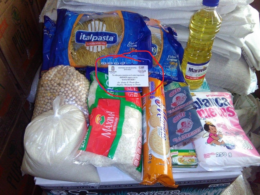 Cabe señalar que las despensas armadas que anunció el Ayuntamiento son 2 mil llevan una tarjeta con el nombre del edil y su esposa para que el beneficiario lo tenga presente.