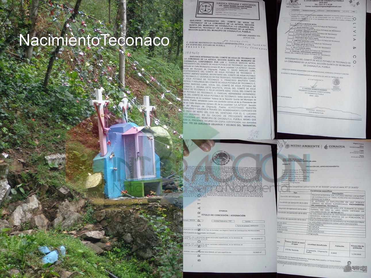 Con el Juez en Materia de Amparo de Trabajo y Servicios Federales está integrado el folio número 3889650 y en breve esperan la sentencia, debido a que la citada Asociación administra el manantial denominado Teconaco de manera indebida por el hecho de que el predio a donde está el nacimiento es propiedad del padre de Rogelio Carlos Platas, presidente de la Agrupación, sin embargo el título de concesión lo  otorgó la Comisión Nacional del Agua (Conagua) con fecha de emisión 20 de abril de 2022 a nombre del Ayuntamiento y es el número 846436, además de que el Comité debe regular la situación, mismo que constituido el 3 de enero de 2021 con anuencia del mismo gobierno municipal.
