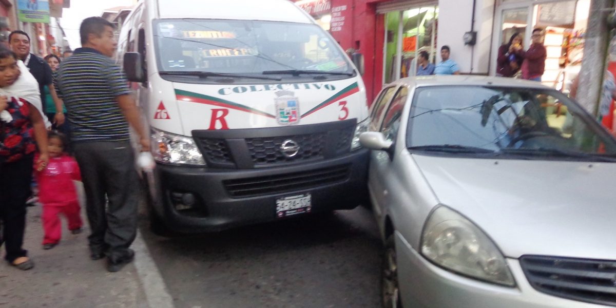 Colectiva de la Ruta 3 se impacta con auto particular en el centro de Teziutlán El hecho se suscitó alrededor de las 18:46 horas sobre la calle 16 de septiembre, casi frente a las instalaciones del SUTERM, y en este no hubo ningún lesionado, solo daños materiales menores, por lo que cada conductor se hizo responsable del golpe al ser