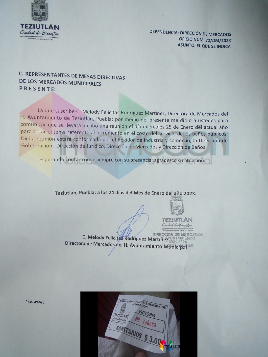 Teziutlán. – Dirigentes y representantes de las mesas directivas de los diferentes mercados rechazaron el aumento del costo por el uso de sanitarios públicos, pues la idea de las autoridades municipales que preside Carlos Peredo, era que los concesionarios y comerciantes pagaran en lugar de 1, 2 pesos, y usuarios 5 pesos y no los 3 que es lo que cobran actualmente por el servicio.