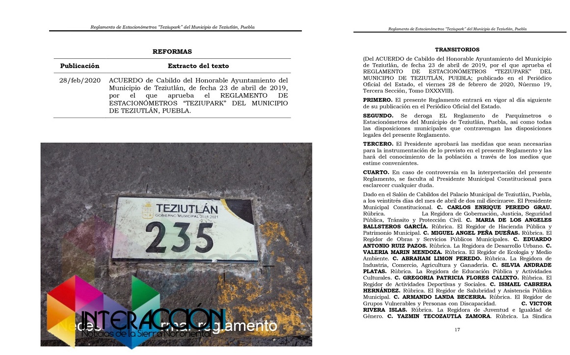Teziutlán.- El lunes 28 de enero de 2019, a escasos tres meses y días del nuevo gobierno municipal Peredista inició la aplicación del Sistema Virtual de Parquímetros denominado “Teziupark”, tras el anuncio del mismo con anticipación, sin embargo aun y cuando hubo a partir de la fecha en mención el cobro del mismo y enseguida las sanciones a automovilistas, el reglamento lo aprobaron en Cabildo el 23 de abril de ese año y hasta el 28 de febrero de 2020 fue publicado en el Periódico Oficial del Estado y de acuerdo con la Ley al día siguiente de su publicación entró en vigor.