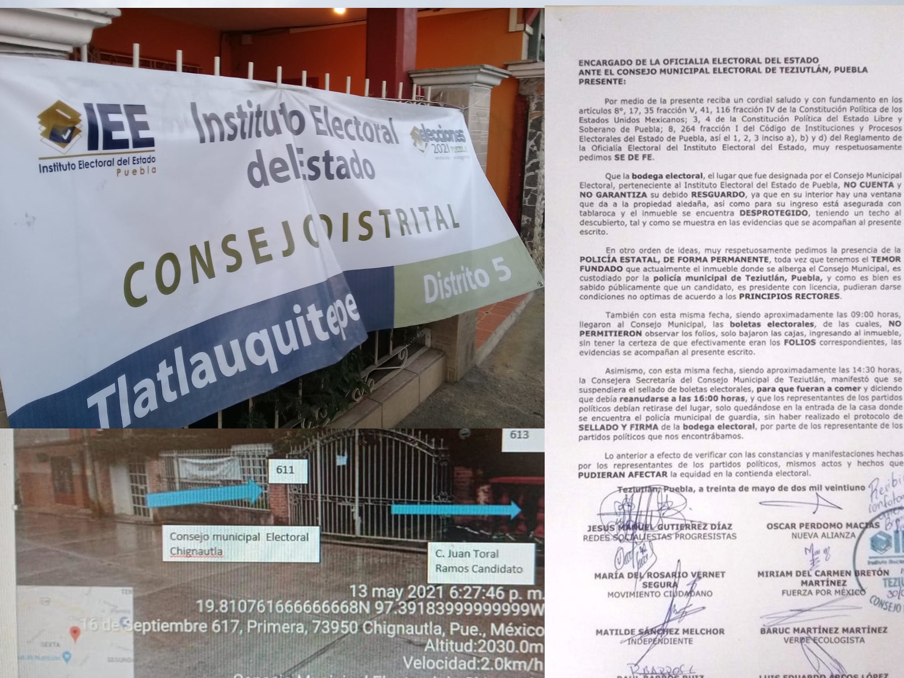 En Chignautla, cuatro representantes de partidos políticos en un escrito dieron a conocer lo que consideran una anomalía en base al Código de Instituciones y Procedimientos Electorales del Estado de Puebla para que de manera urgente cambien el domicilio del Consejo Municipal, en virtud de que ni la imparcialidad, ni la seguridad se encuentran garantizadas, al estar ubicado en el número 611 de la calle 16 de septiembre, dentro de la sección primera del municipio, y justo a un lado se encuentra la casa de Juan Toral, candidato de la alianza de Morena, PT y Compromiso por Puebla, pues está se ubica en el número 613.