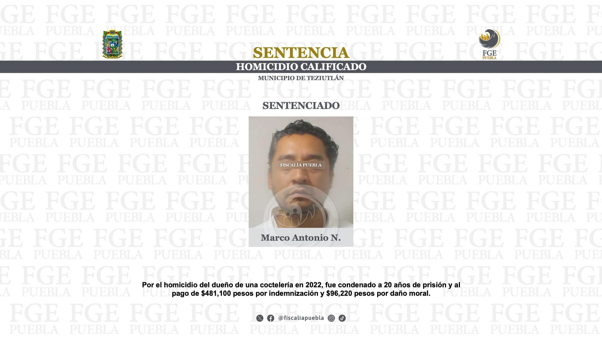 La Fiscalía General del Estado (FGE) da a conocer que obtuvo sentencia de 20 años de prisión contra Marco Antonio N., penalmente responsable de homicidio calificado en contra del señor Antonio, conocido popularmente como Toño Camarones, tras lesionarlo en el cuello con arma blanca al interior de su establecimiento ubicado en la calle Matamoros del centro de Teziutlán.