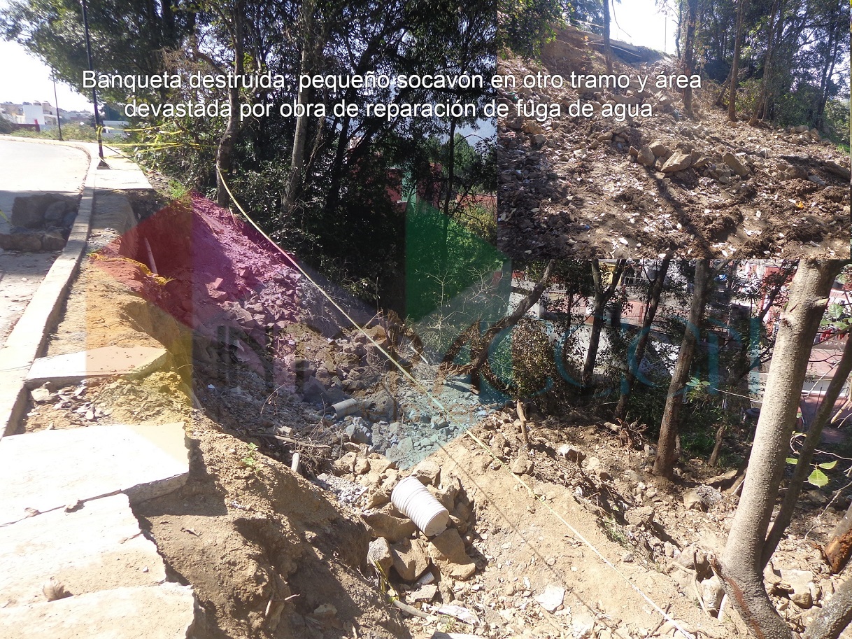 La fuga de agua tiene semanas que se presentó y al ser reportada la anomalía a la dirección de Agua Potable acudieron al llamado para repararla, pero fue necesario que descubrieran para encontrar la falla en la red, hasta destruir una parte de la banqueta, pero así dejaron y no hay a la fecha continuidad en los trabajos, y la zona está vulnerable hasta por una precipitación pluvial, pese a que el pavimento y las banquetas son prácticamente nuevas.