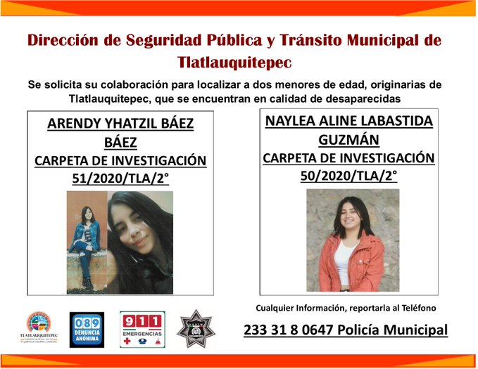 Naylea Aline Labastida Guzmán de 13 años de edad, fue vista por última vez el pasado martes 4 del presente mes, y en breves días fue la integrada la CDI 50/2020/TLA/2º, y también Arendy Yhatzil Báez Báez de 16 años de edad fue reportada como desaparecida de forma seguida, por ello de igual manera sus familiares acudieron a la Agencia del Ministerio Público y quedó registrada la CDI 51/2020/TLA/2º.