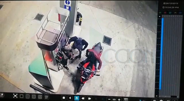 Y es que dos sujetos a bordo de una motocicleta color roja, a quienes no se les observa el rostro, porque llevaban gorra, llegaron como cualquier cliente y al estar cerca el despachador lo acorralaron y uno de ellos, que era la persona que viajaba como copiloto descendió, luego de cubrirse bien el rostro y utilizó un arma punzo cortante para amagar y exigirle el dinero en efectivo que tenía a la mano, y acto seguido de inmediato huyeron de la estación de servicio.