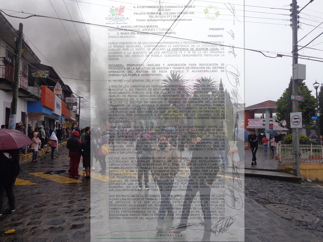 Chignautla. – Tras llegar a acuerdos integrantes del gobierno municipal con los representantes de los diversos Comités de Agua Potable de este municipio, finalmente la tarde del anterior martes 8 de diciembre en sesión  extraordinaria de Cabildo los regidores y edil dieron marcha atrás a la creación del Sistema operador de Agua Potable y Alcantarillado de Chignautla (Sosapachig),  pues al saber de este acuerdo desató la furia de un grupo de pobladores que llegaron al extremo de incendiar el palacio municipal que acabó con documentación, archivo histórico, equipos de cómputo y mobiliario de diferentes áreas de la Comuna, el anterior lunes 30 de noviembre, al no llegar a dialogar con los manifestantes, el presidente municipal, Luciano Aparicio Rodrigo.