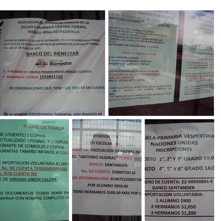 En el caso de la Escuela “Manuel Ávila Castillo” el dinero solicitado fue de mil pesos para este año, y para la institución del turno vespertino “15 de noviembre”, la cual tiene mucho menos alumnos, el recurso que pidieron como inscripción fue de 450 pesos por padre de familia.