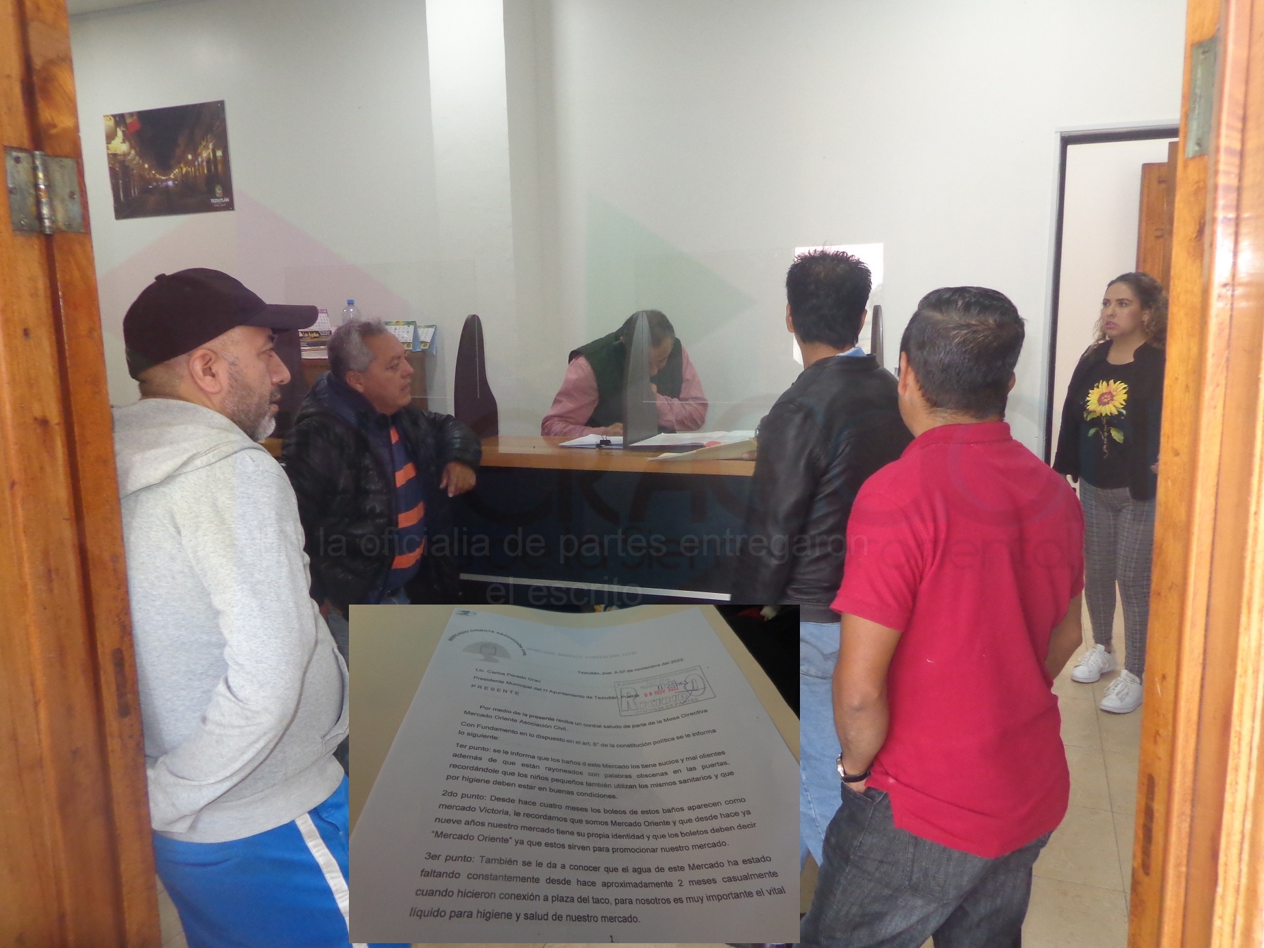 Teziutlán. – Un escrito basado en el ejercicio del derecho de petición de acuerdo con el artículo octavo de la Constitución, entregaron integrantes de la mesa directiva del mercado Oriente en tres puntos específicos, por ello piden una solución de inmediata, ya que han hecho solicitudes de manera verbal con nula respuesta, versadas en que los sanitarios lucen insalubres y mal olientes, el boletaje de los mismos refiere que son mercado Victoria desde hace cuatro meses, y el inmueble tiene su propia identidad, y desde hace dos meses les falta el agua lo que coincide con las obras de la plaza del venado, antes plaza del taco, y es de vital necesidad para una mayor higiene.