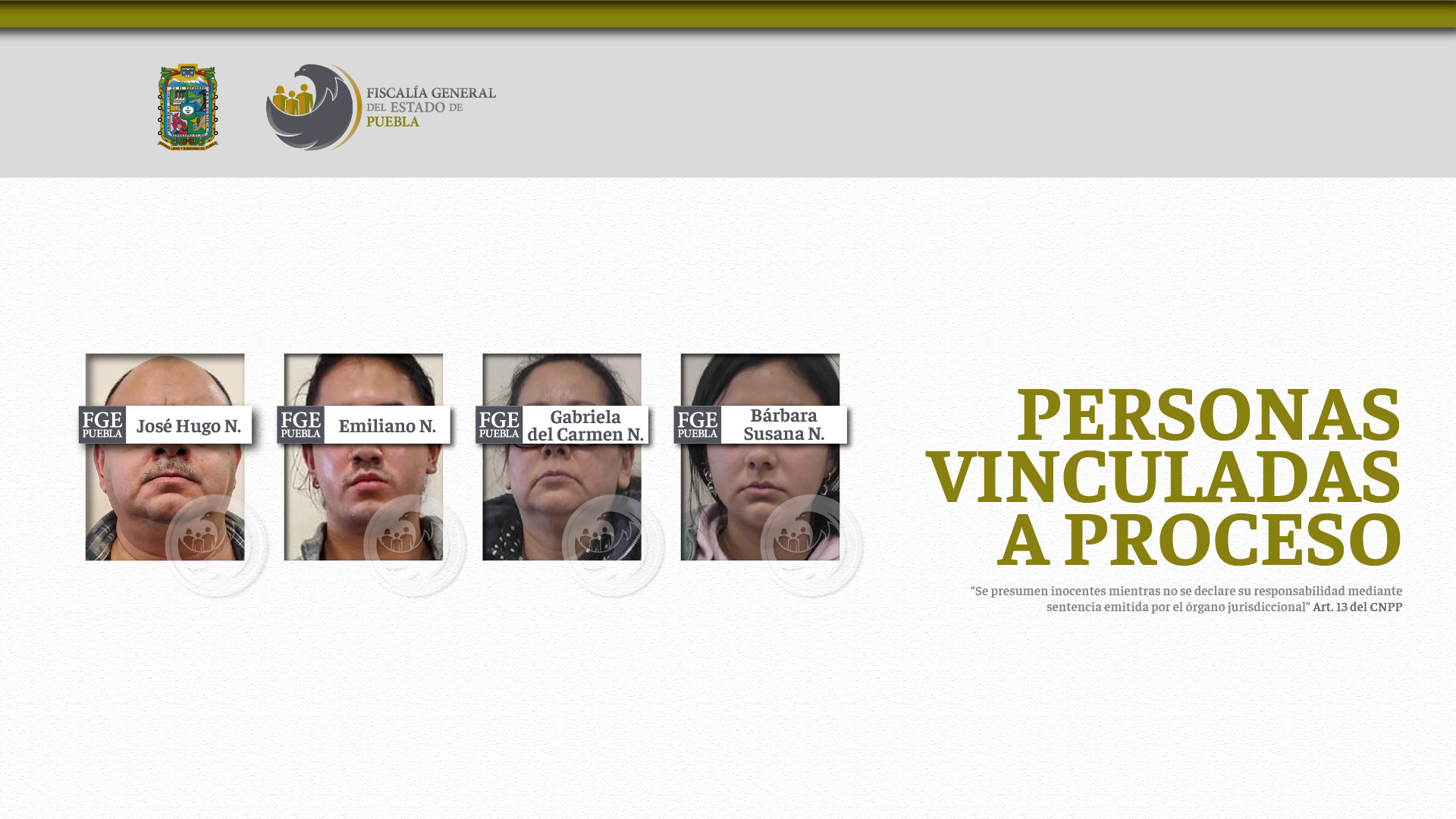 En seguimiento a la investigación por delitos contra la salud en su modalidad de narcomenudeo con fines de suministro, la Fiscalía General del Estado de Puebla logró obtener la vinculación a proceso de José Hugo N., Emiliano N., Gabriela del Carmen N. y Bárbara Susana N.