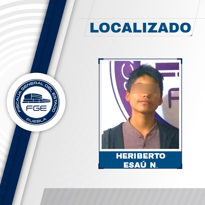 Resultado del desahogo de diversas diligencias la Fiscalía General del Estado de Puebla ubicó a Heriberto Esaú N. de 14 años de edad, reportado como desaparecido.