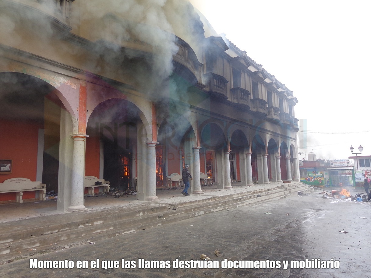Chignautla. –Documentación oficial reducida a cenizas, así como mobiliario y demás equipo de la Secretaria General de Ayuntamiento, Presidencia, Registro Civil, Tesorería y Seguridad Pública, y el interior del inmueble con severos daños, deterioros en un cajero automático de Santander, así como dos Policías Municipales lesionados con piedras, y otros de la Guardia Nacional, fue el resultado de la enardecida manifestación llevada a cabo por cientos de habitantes que esperaron al edil, Luciano Aparicio Rodrigo, pero no llegó, esto en busca de echar abajo el acuerdo del 19 de noviembre, crear un Sistema Operador de Agua Potable, pues siempre se han regido por usos y costumbre a través de la existencia de Comités de Agua en las más de 20 comunidades.