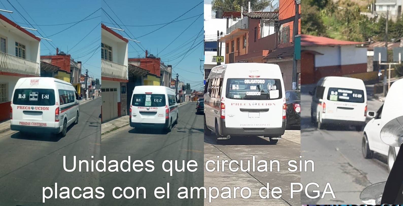 Como ejemplo y prueba, los números que algunas de las camionetas que cubren diferentes ramales son, 10, 81,24, 7, pero en las bases se puede notar que llegan y salen muchas colectivas sin placas, las cuales presuntamente ya tienen años trabajando así.
