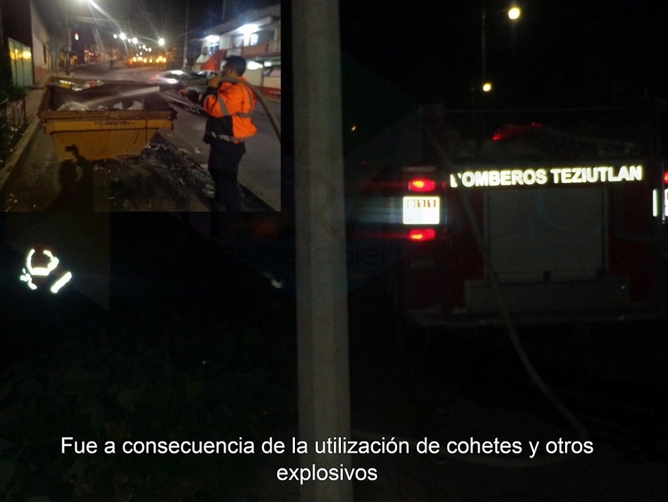 Teziutlán. – Al finalizar el año y principiar el 2022, elementos de Protección Civil Municipal y Bomberos acudieron a apagar incendios que se registraron en contenedores de basura y en una barranca del Callejón de Las Flores, todos provocados por explosivos arrojados, lo que no pasó a mayores por fortuna.