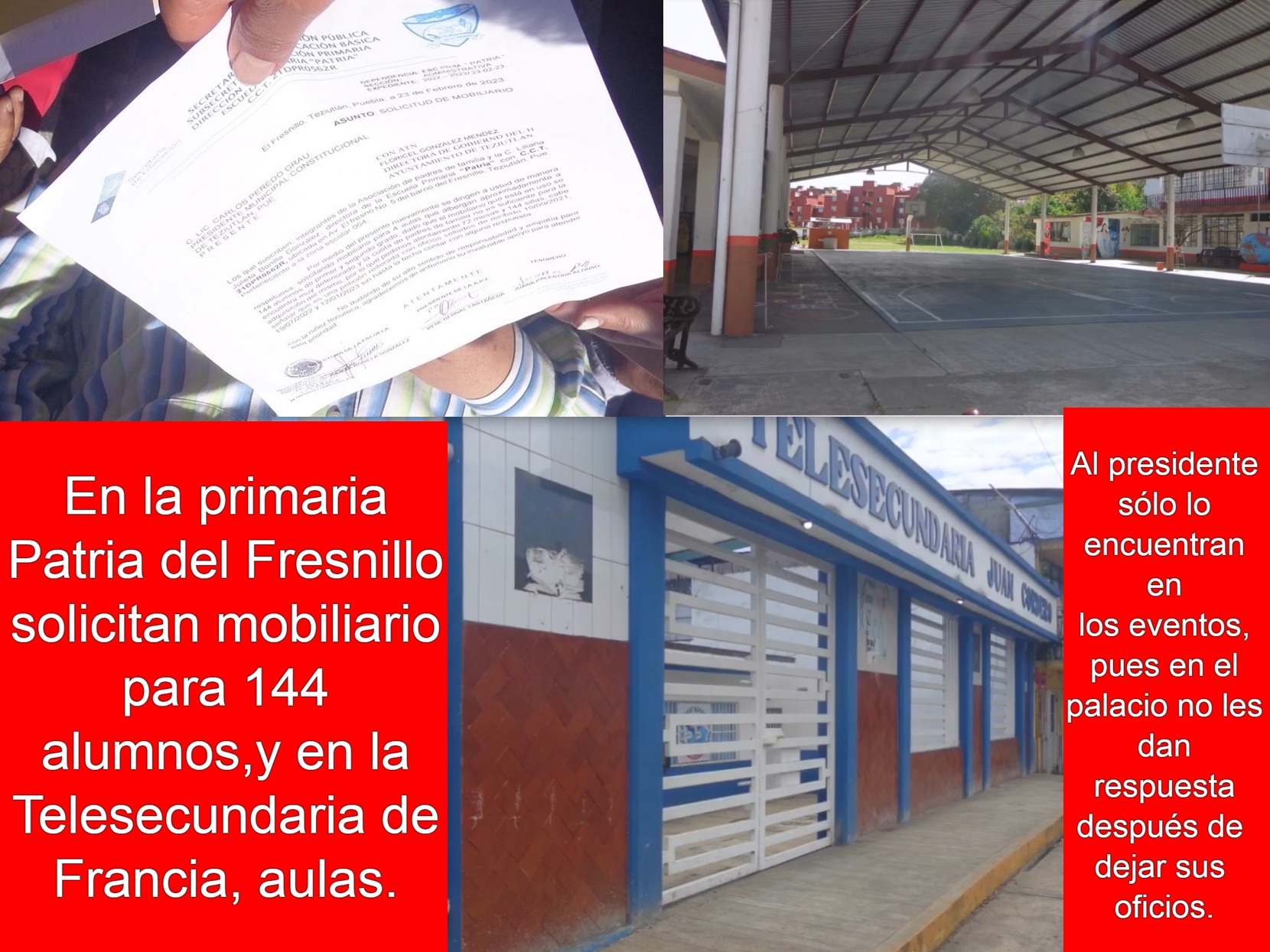 En el oficio que entregaron especifican que el mobiliario que requieren es para 4 aulas de primero y segundo grado, en las que albergan a un total de 144 alumnos, por lo tanto, necesitan igual número de sillas y 72 mesas y como el recurso que captan vía aportaciones no alcanza, es por lo que mediante oficios han solicitado al Ayuntamiento en tres ocasiones anteriores el apoyo (19 de septiembre de 2021, 19 de julio de 2022 y el pasado 12 de enero).