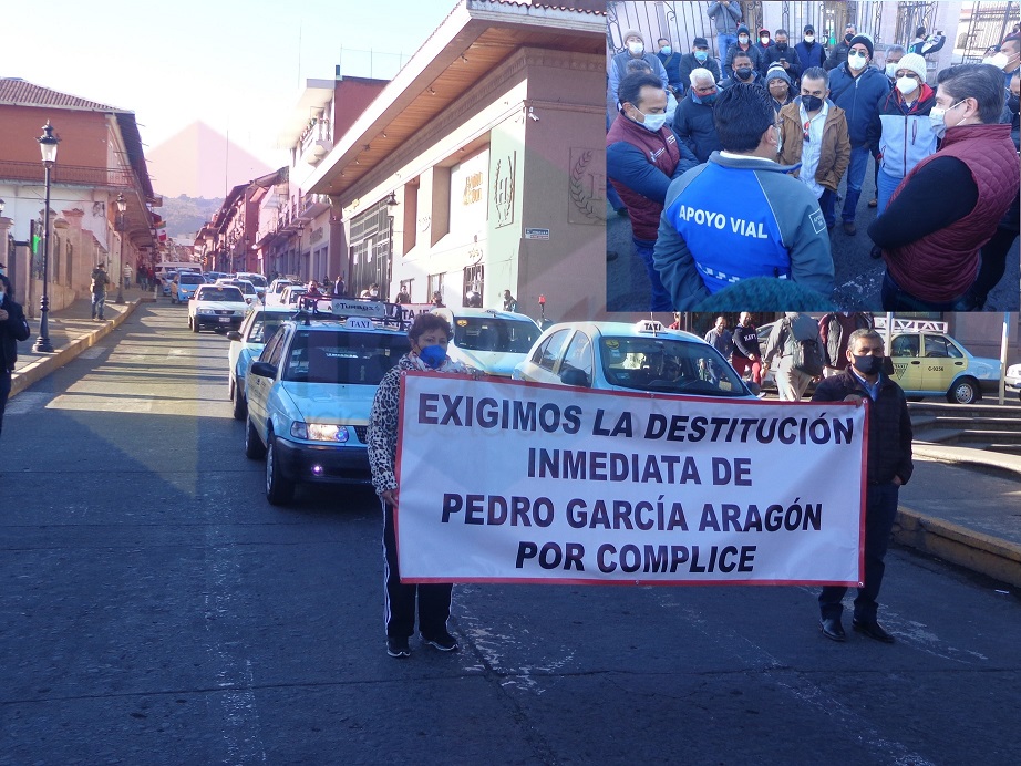 Teziutlán. – En manifestación y bloqueo, decenas de taxistas, entre concesionarios y trabajadores del volante exigieron que el gobierno municipal que preside, Carlos Peredo Grau, saque las manos para proteger a las unidades particulares que prestan el servicio irregular de taxi, pues varios trabajadores del Ayuntamiento están inmersos en la actividad, y a su vez exigen hasta la renuncia del delegado de la Secretaria de Movilidad y Transporte (SMT) Pedro García Aragón, por ello pidieron una mesa de dialogo pero pública, para que se desarrolle en el parque municipal con la presencia del primer regidor.