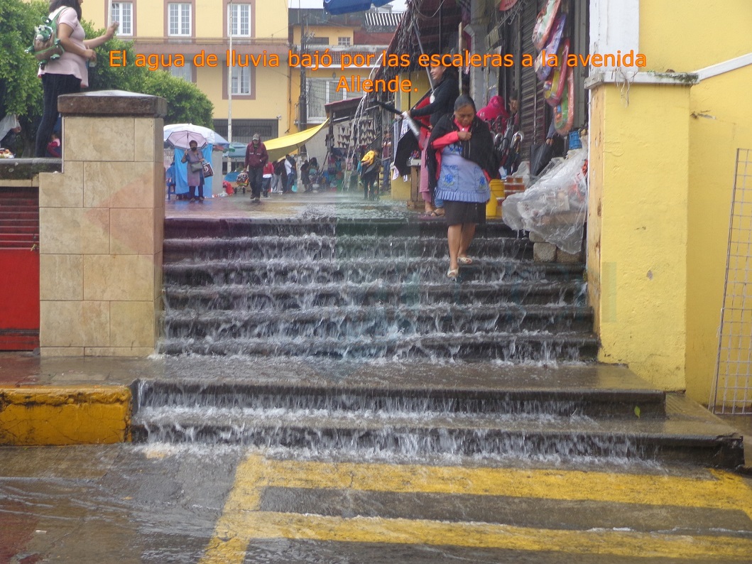 Anteriormente los desechos residuales salían por las alcantarillas, y por ese motivo el Ayuntamiento las canceló, y con la nueva techumbre de la explanada Benito Juárez parte del agua de lluvia cae al parque, en tanto las cunetas estaban completamente bloqueadas, por que el tubo no se da abasto y por residuos acumulados en las atarjeas.