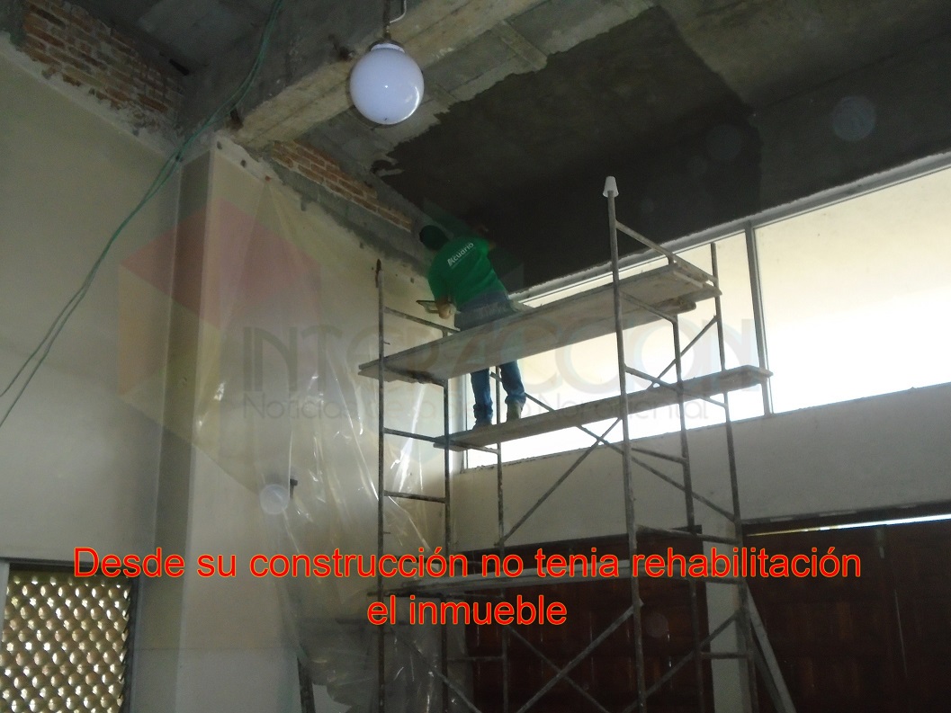 Como se recodará a partir del anterior fin del mes de junio inició la labor, en primer lugar, con la impermeabilización de la azotea y ahora llevan a cabo el escarpeado y luego el tirol en la bovedilla del techo de la inmueble y enseguida sigue la rehabilitación de pintura en parte externa e interna.