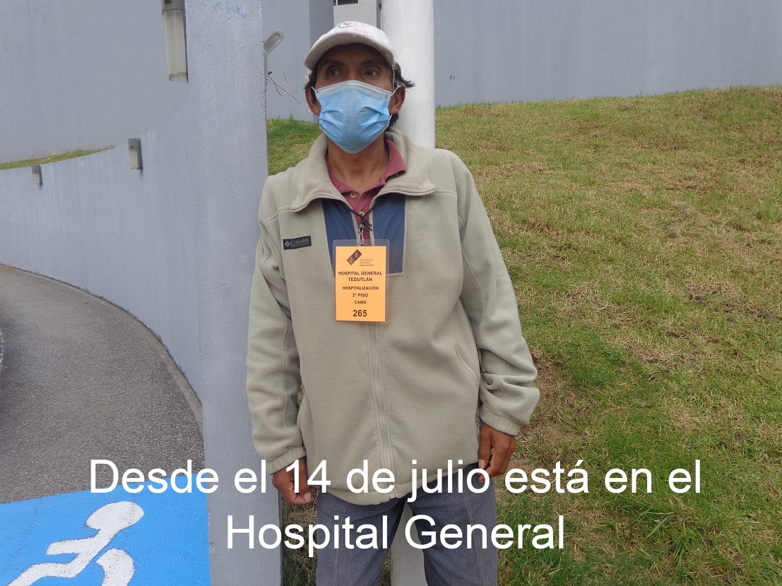 Aseguró que desde el pasado miércoles 14 de julio se encuentra en el nosocomio dependiente de la Secretaría de Salud, y sólo, pues su esposa se quedó para recuperarse físicamente, y desde esa fecha ha estado día y noche en el nosocomio y periferia del mismo, y la mayoría de veces no ha tenido ni para pagar los 15 pesos que le piden que les cobran por desayuno o comida, en el albergue que se ubica en la parte contigua.
