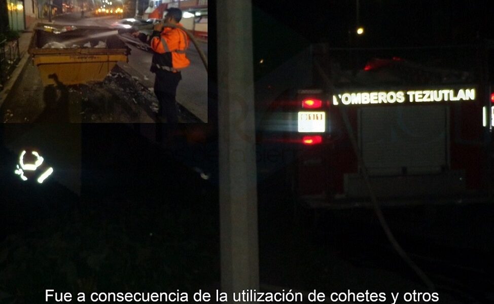 PC de Teziutlán atendió reportes de incendio en predio del Callejón de Las Flores y contenedores de basura Teziutlán. – Al finalizar el año y principiar el 2022, elementos de Protección Civil Municipal y Bomberos acudieron a apagar incendios que se registraron en contenedores de basura y en una barranca del Callejón de Las Flores, todos provocados por explosivos arrojados,