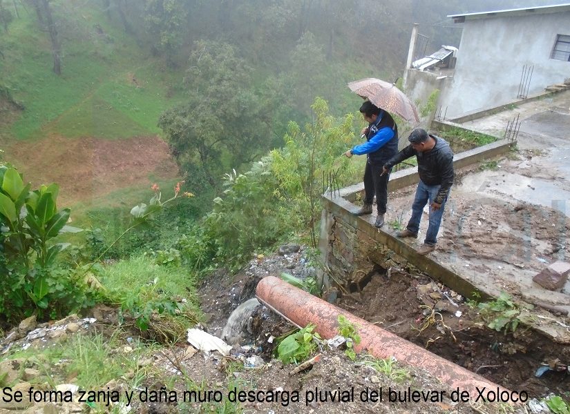 Descarga pluvial del bulevar que se construye en Xoloco ya causó afectaciones en una casa y la barranca Nadie de la empresa constructora se hacia presente a las primeras horas de este jueves Por Fausto Hernández Teziutlán.– Debido a las fuertes precipitaciones pluviales y por consiguiente a la mala planeación de la obra, parte de una vivienda se encuentra vulnerable,