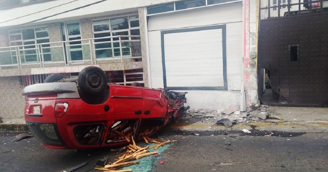 Teziutlán.- Una vagoneta tipo voyager termino volcada, tras quedarse sin frenos y chocar contra una camioneta de gas, por lo que debido al impacto el auto particular de color rojo con placas de circulación YHR-41-60 del estado de Veracruz termino volcado de manera transversal al grado de daño parte de la fachada de una vivienda de la avenida principal