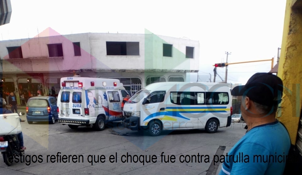 Teziutlán.– De acuerdo a versión de testigos una patrulla de la Policía Municipal chocaría con una colectiva de la Ruta 1, unidad que se dirigía a la parte sur, percance que se originó cuando la camioneta del transporte público cruzaba el crucero de la calle Mina para incorporarse al circuito, Rafael Martínez de la Torre, desconociéndose al momento cual chófer tuvo la culpa.