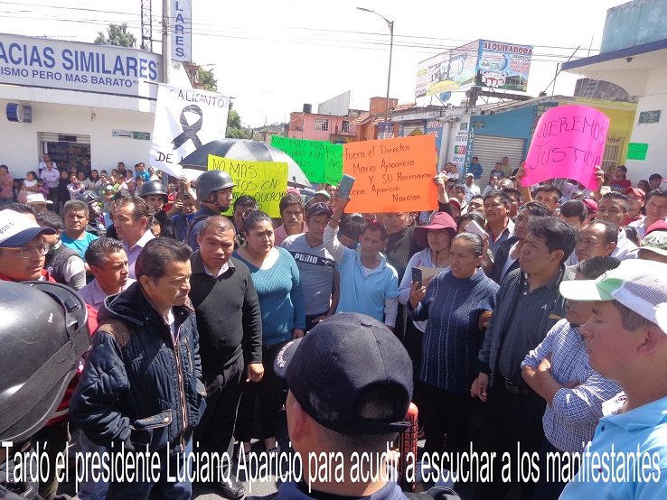 Desde el inicio exigieron la presencia del presidente municipal, Luciano Aparicio Rodrigo, pero llegó el director de la Policía Municipal, Mario Aparicio para pedir que una comisión de inconformes acudieron a la presidencia para entablar un dialogo, pero se negaron, pues querían la presencia del alcalde, quien después de varios minutos llegó a la zona de La Linda Tarde, en donde le expusieron la serie de inconformidades.
