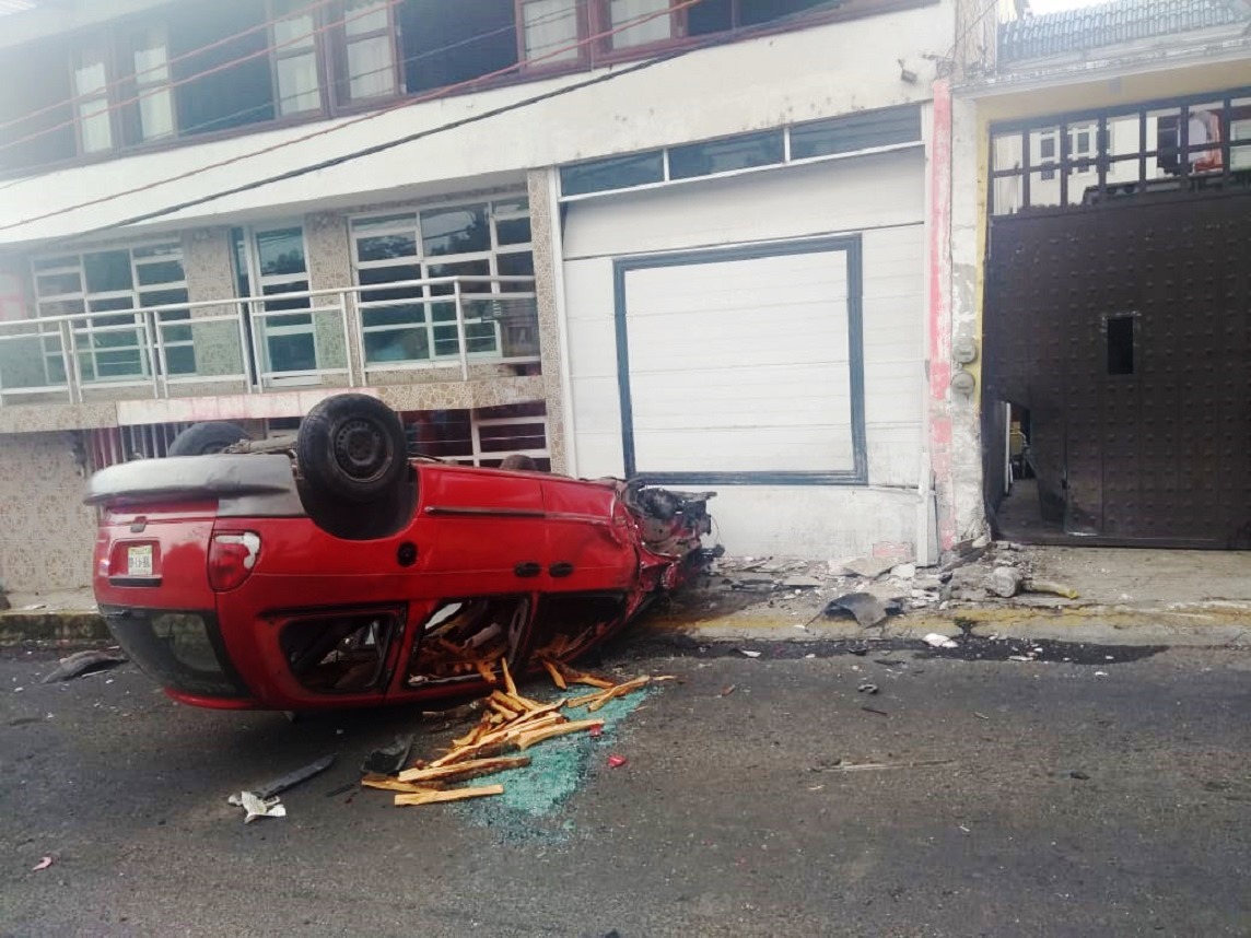 Teziutlán.- Una vagoneta tipo voyager termino volcada, tras quedarse sin frenos y chocar contra una camioneta de gas, por lo que debido al impacto el auto particular de color rojo con placas de circulación YHR-41-60 del estado de Veracruz termino volcado de manera transversal al grado de daño parte de la fachada de una vivienda de la avenida principal del Barrio de Ixticpan, hecho suscitado minutos antes de las 16:00 horas de este sábado, en el que el chofer resultó lesionado.