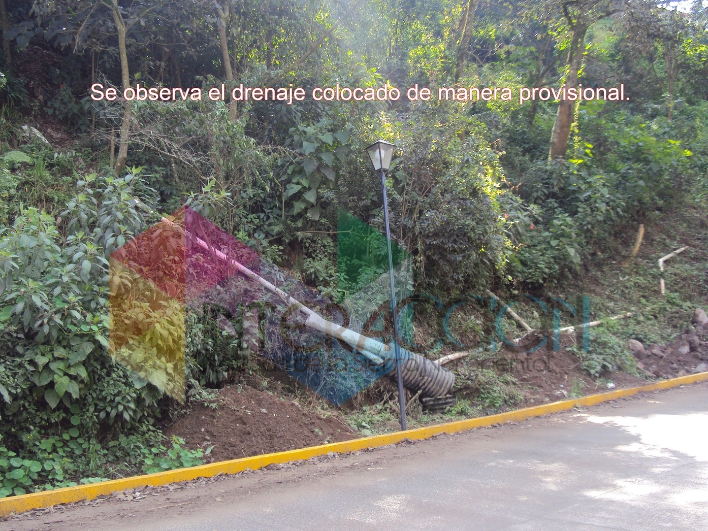 El drenaje baja con tubería de plástico y es captada de forma provisional, y otra parte de las aguas residuales están a cielo abierto, escurren por el talud y se esparcen por el terreno de la entrada del Arco Francia para irse a las cajas de registro.