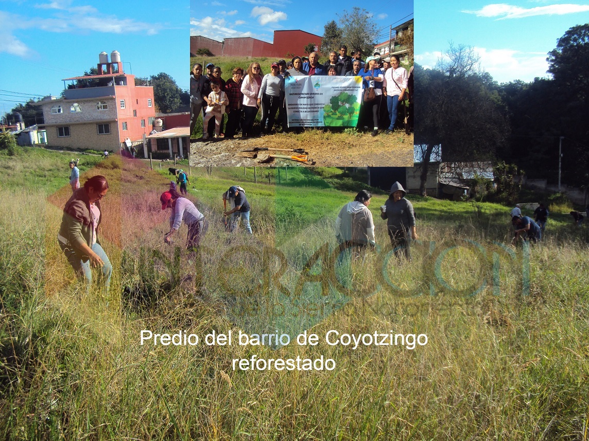 La funcionaria del gobierno municipal hizo notar que en el caso de la última etapa de reforestación en Coyotzingo, se justifica porque cerca hubo una construcción, refiriéndose al denominado Arco Francia, y por lo mismo hubo tala de árboles y con ello cambio de uso de suelo, presentándose daño al ecosistema-común en este tipo de situaciones, de ahí que crear pulmones verdes y equilibrar el que las plantaciones proporcionen oxígeno y absorban bióxido de carbono.