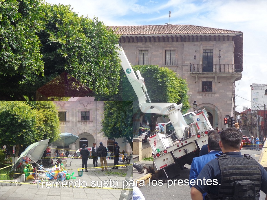 El hecho se registró cerca de las 11:00 horas de este lunes, cuando de manera repentina la unidad se ladeo, por tanto pasó a tirar el poste de alumbrado, y terminó la canastilla cayendo encima del puesto de globos, afectando de esta manera a la comerciante, mientras que a quien estaba adentro de la misma, dicen testigos que brincó para evitar ser lesionado, y apoyó a la mujer que se dolía por el golpe en la cabeza.