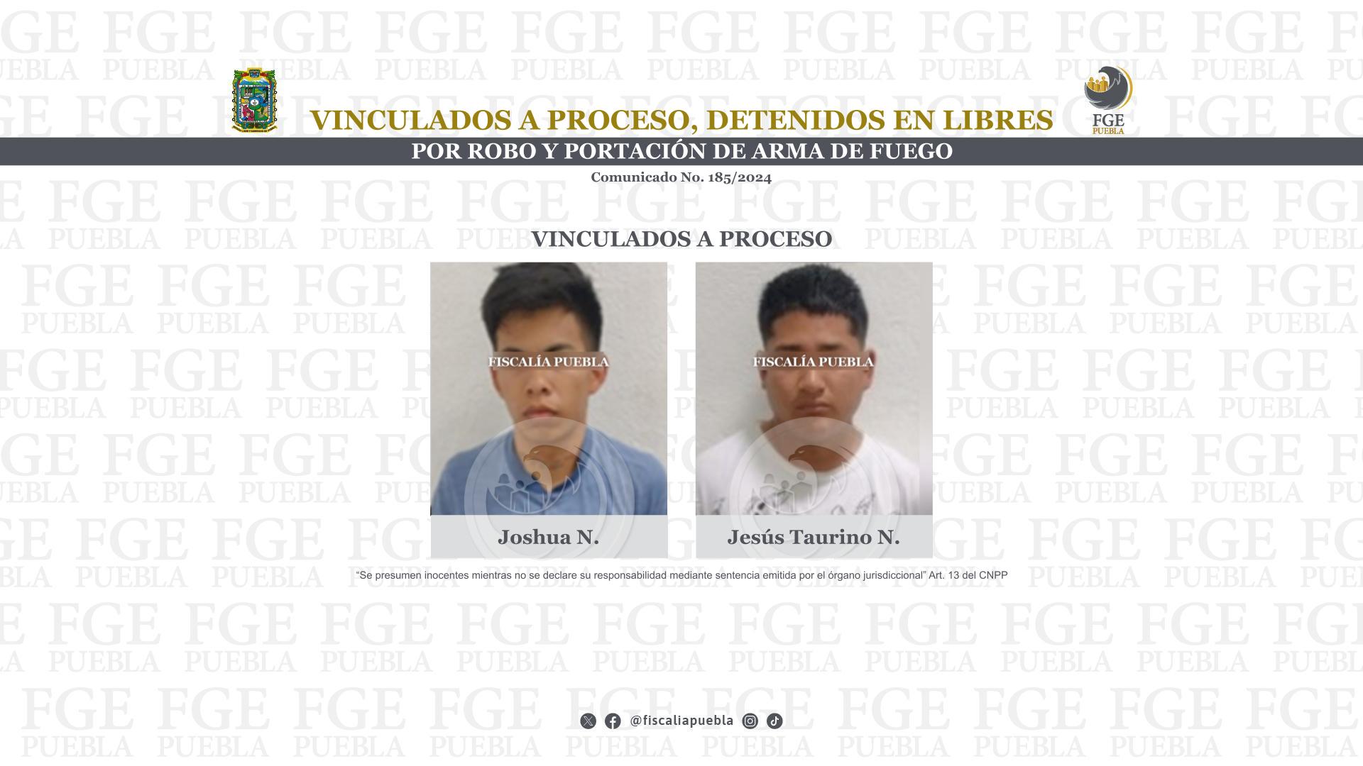 La Fiscalía General del Estado de Puebla obtuvo la vinculación a proceso de Joshua N. y Jesús Taurino N. por su posible responsabilidad en los delitos de robo agravado y portación de arma de fuego sin licencia.
